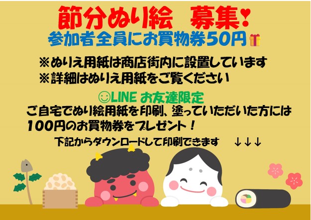 ぬりえを塗って、お買物券を受け取り、お得にお買い物をして、今年も節分を楽しもう!!