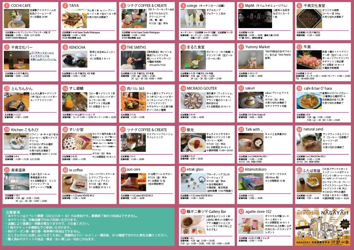 | 開催場所 | 北加賀屋エリアのカフェ、居酒店、雑貨屋、マッサージ、ワークショップ、銭湯など32店舗 |