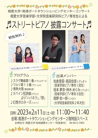 相愛大学音楽学部・大学院音楽研究科ピアノ専攻の学生が奏でるピアノコンサートです。 観覧は無料なので、これを機にピアノコンサートに足を運んでみてはいかがでしょうか!