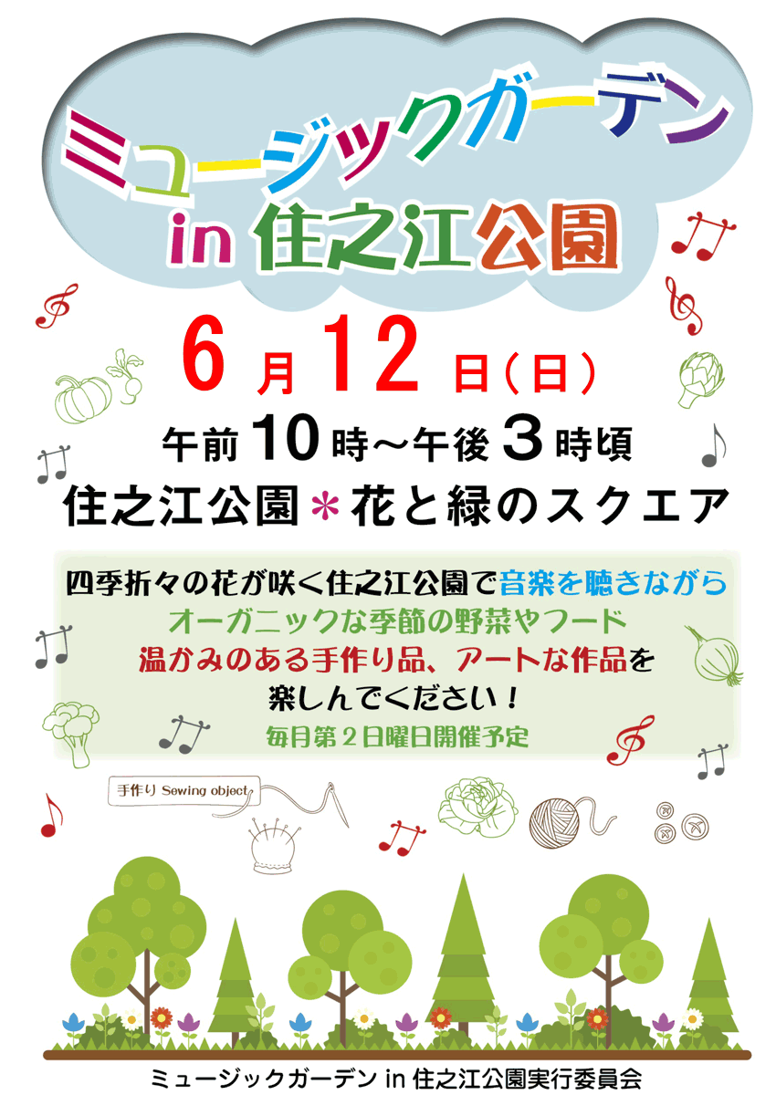 四季折々の花が咲く住之江公園で音楽を聴きながら、 季節のお野菜やフート、手作り品、アート作品など楽しめるイベントです!