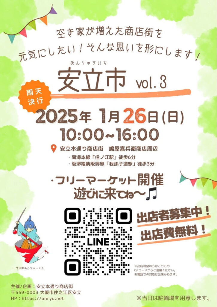雨天決行!安立市vol.3! 安立本通り商店街・嶋屋嘉兵衛商店周辺でフリーマーケットが開催されます! ぜひこの機会に参加して、空き家が増えた商店街をみんなで一緒に元気にしよう!