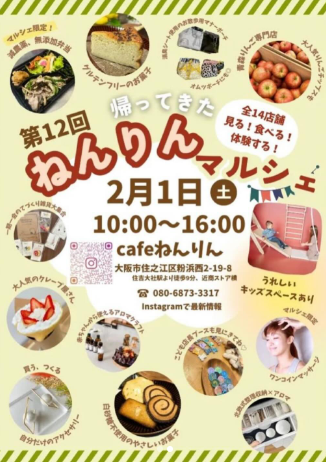 ねんりんマルシェが帰ってきました! マルシェ限定のcafeねんりんのお弁当やグルテンフリーのスイーツや白砂糖不使用の焼き菓子もあります。 たくさんの経験ができるので、親子での参加もおすすめです!
