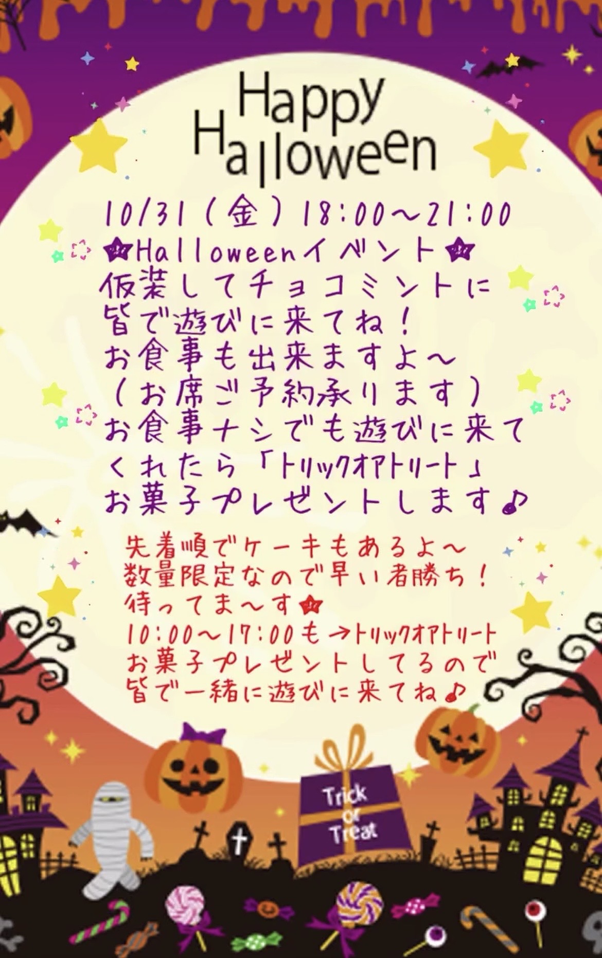 お食事なしでも遊びに来てくれたら「トリックオアトリート」お菓子をプレゼントします!