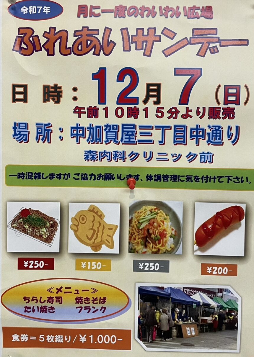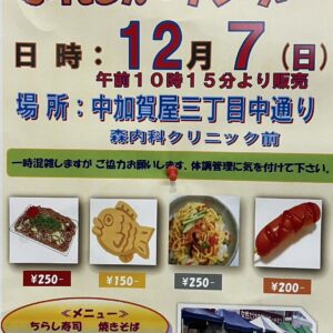地域のみなさんが集まる月に一度のイベントです。 ちらし寿司、焼きそば、たい焼き、フランクフルトをご用意しています!
