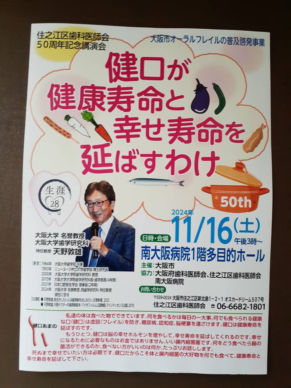 11月16日(土)住之江区歯科医師会50周年記念講演会が行われます。 お口の健康が健康寿命と幸せ寿命を延ばしてくれる、とても大切なお話を大阪大学名誉教授の天野敦雄先生がお話ししてくれます。