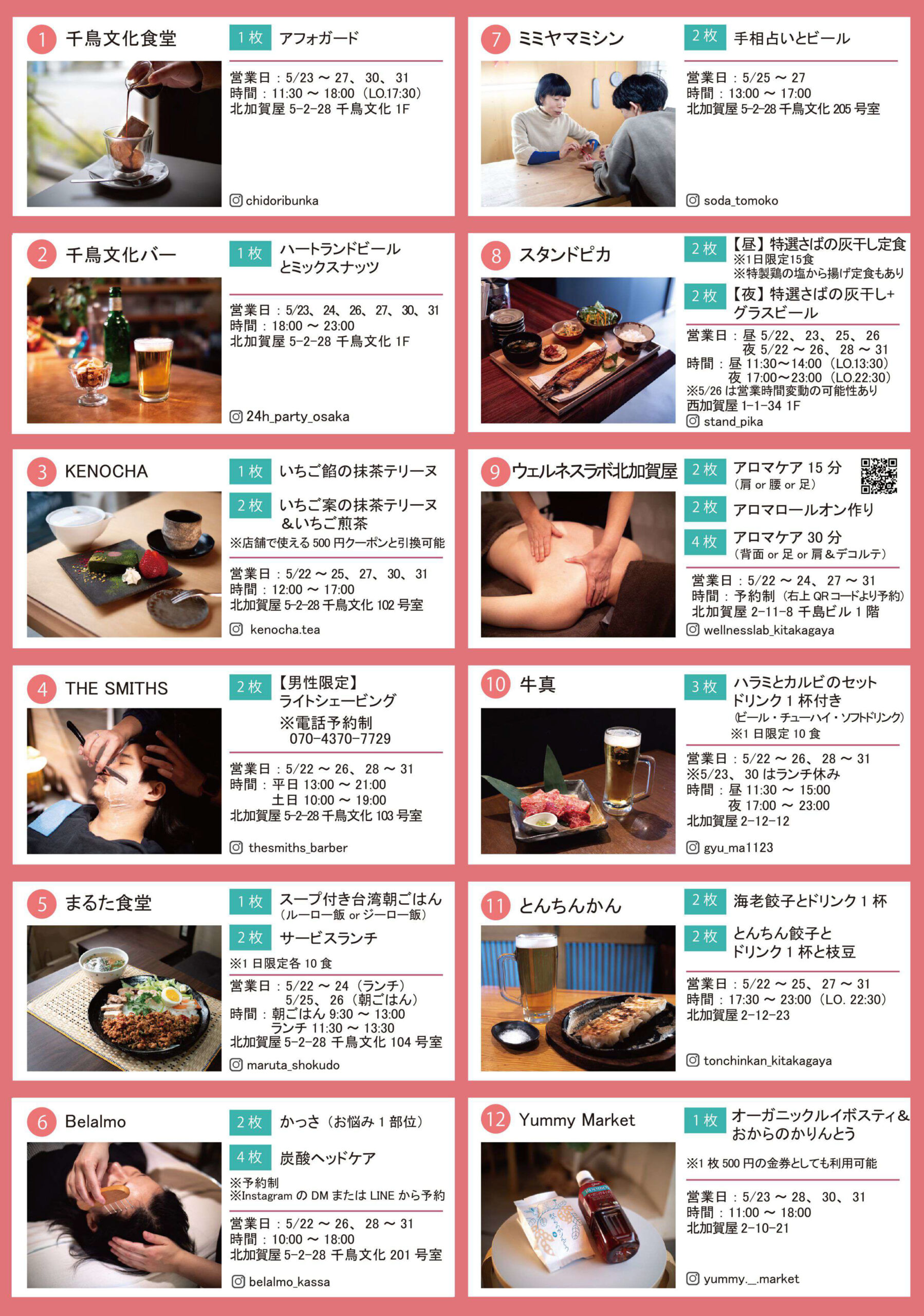 北加賀屋エリアのカフェ、居酒店、雑貨屋、マッサージ、ワークショップ、銭湯など35店舗