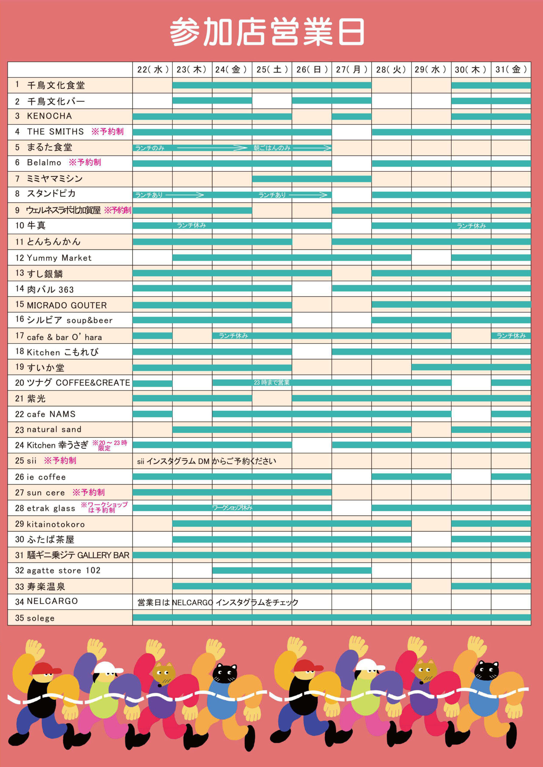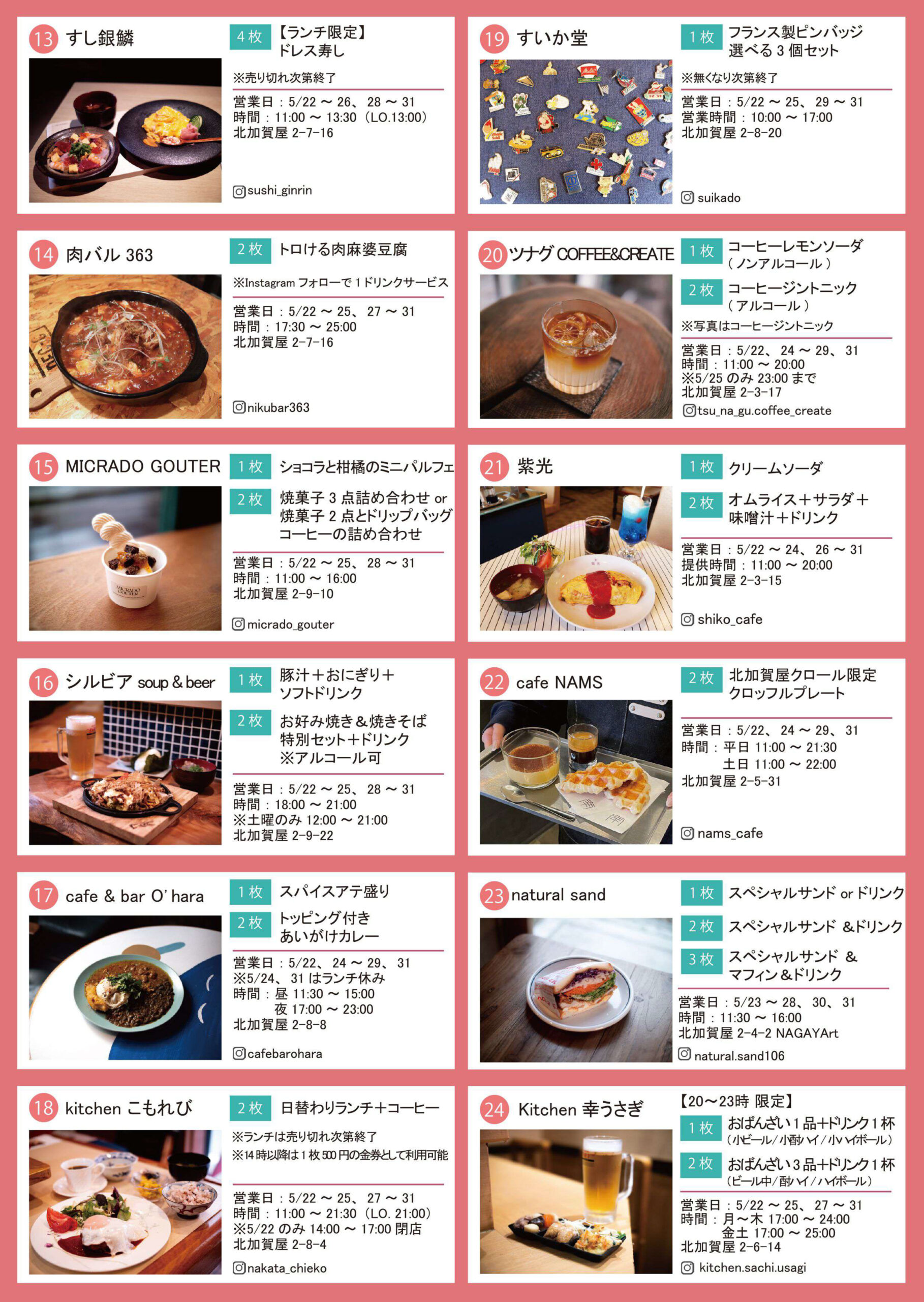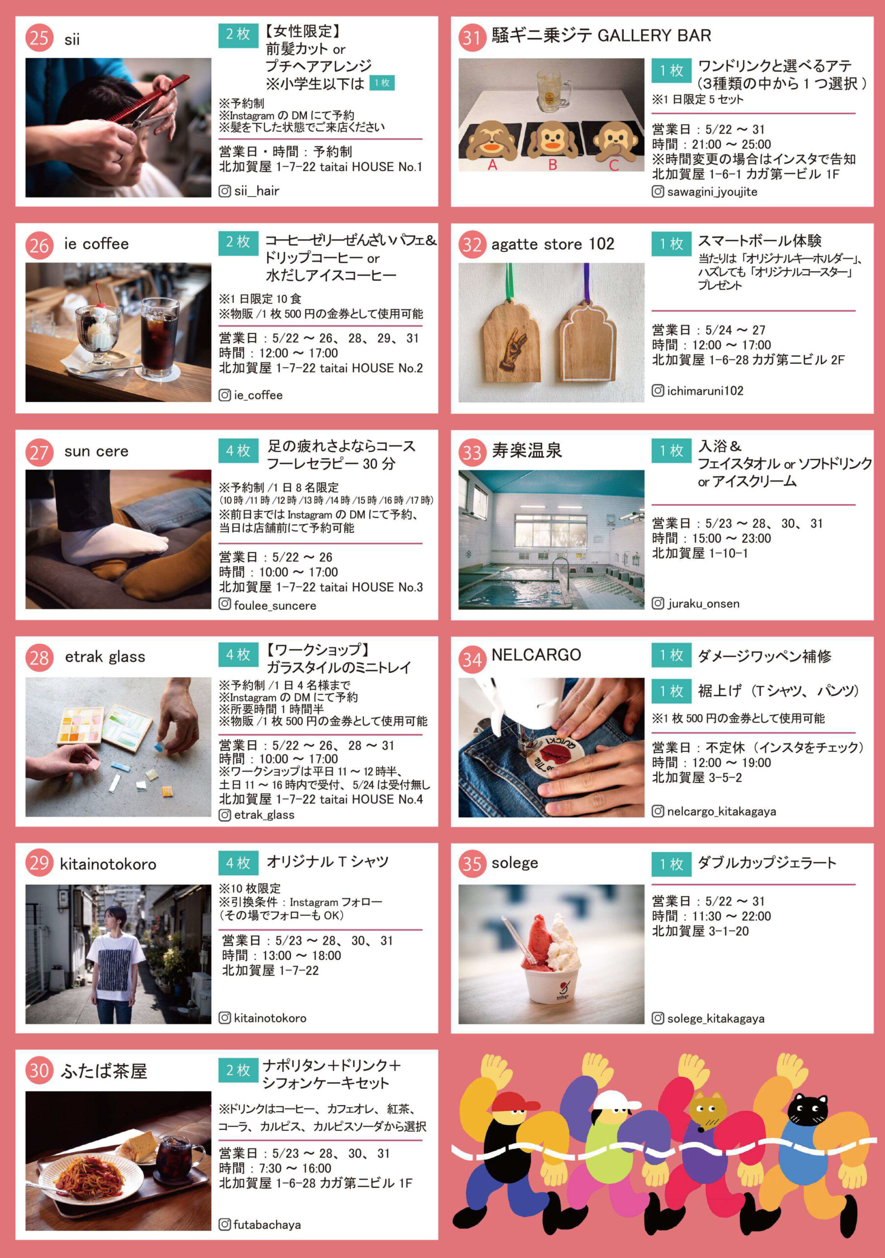 カフェや居酒屋、雑貨店、ワークショップ、銭湯など35店舗が参加。各店舗が、お得な「北加賀屋クロール特別メニュー」を用意し、みなさまをお迎えします。