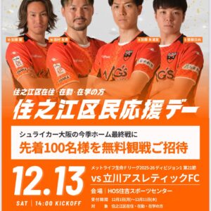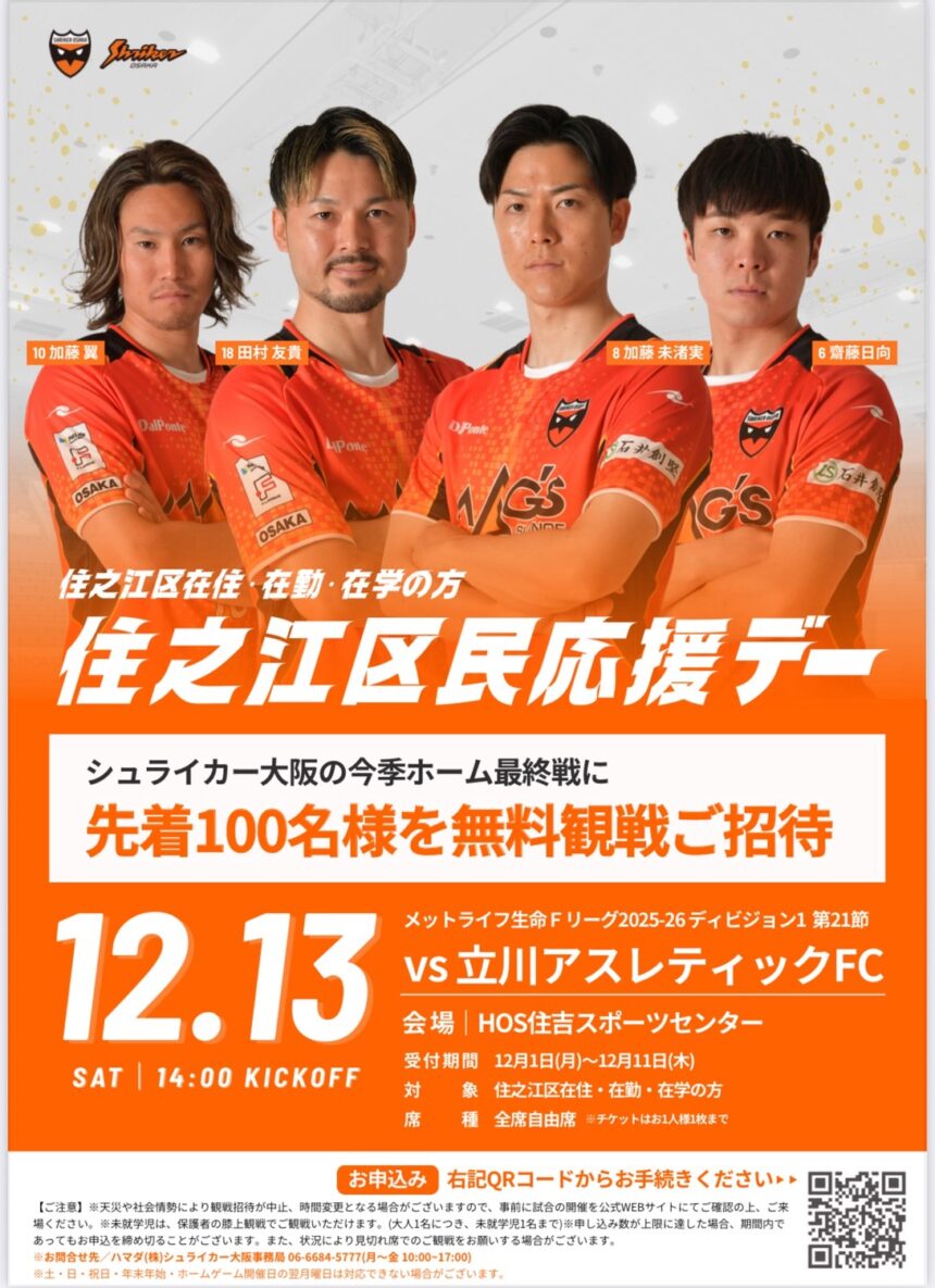 プロフットサルチーム・シュライカー大阪の今季公式ホームゲーム最終戦に住之江区民のみなさんをご招待!