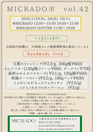 兵庫県丹波篠山 川西恵さんの無農薬野菜、MICRADOで提供しているナチュラルな食材を使用した加工品を量り売りで販売します。