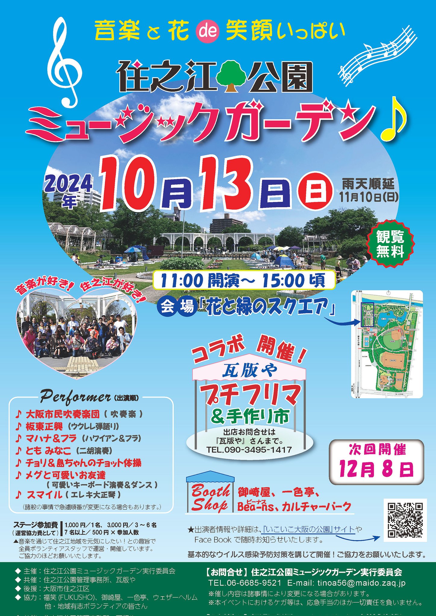 四季折々の花が咲く住之江公園で音楽を聴きながら、 季節のお野菜やフート、手作り品、アート作品など楽しめるイベントです!