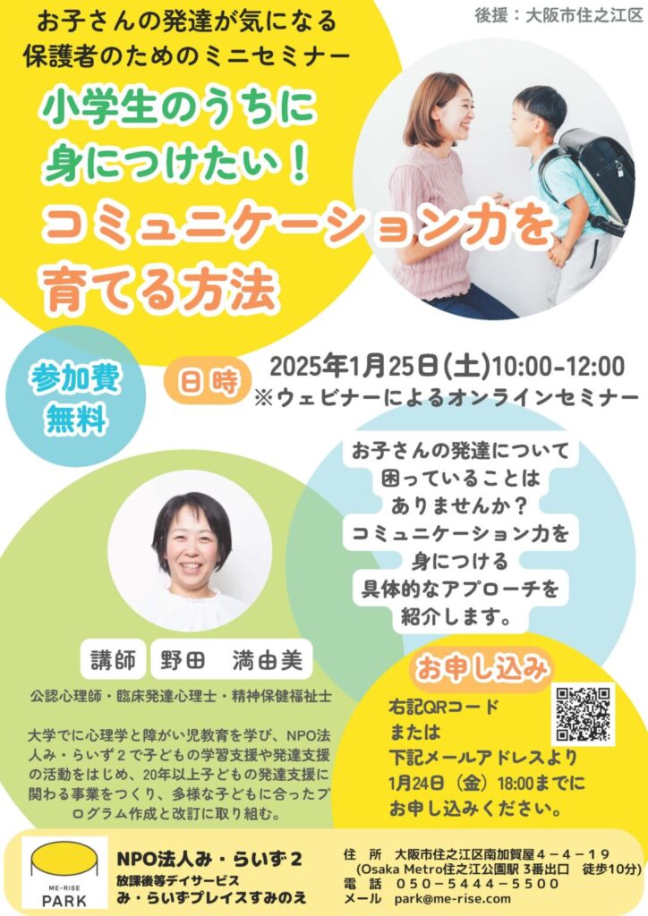 保護者向けのセミナーです。 みらいずプレイスすみのえでは、友だちとうまく関われない、困ったときの発信が苦手な子どもたちが集団生活に必要なソーシャルスキルを身につける療育プログラムを行っています。