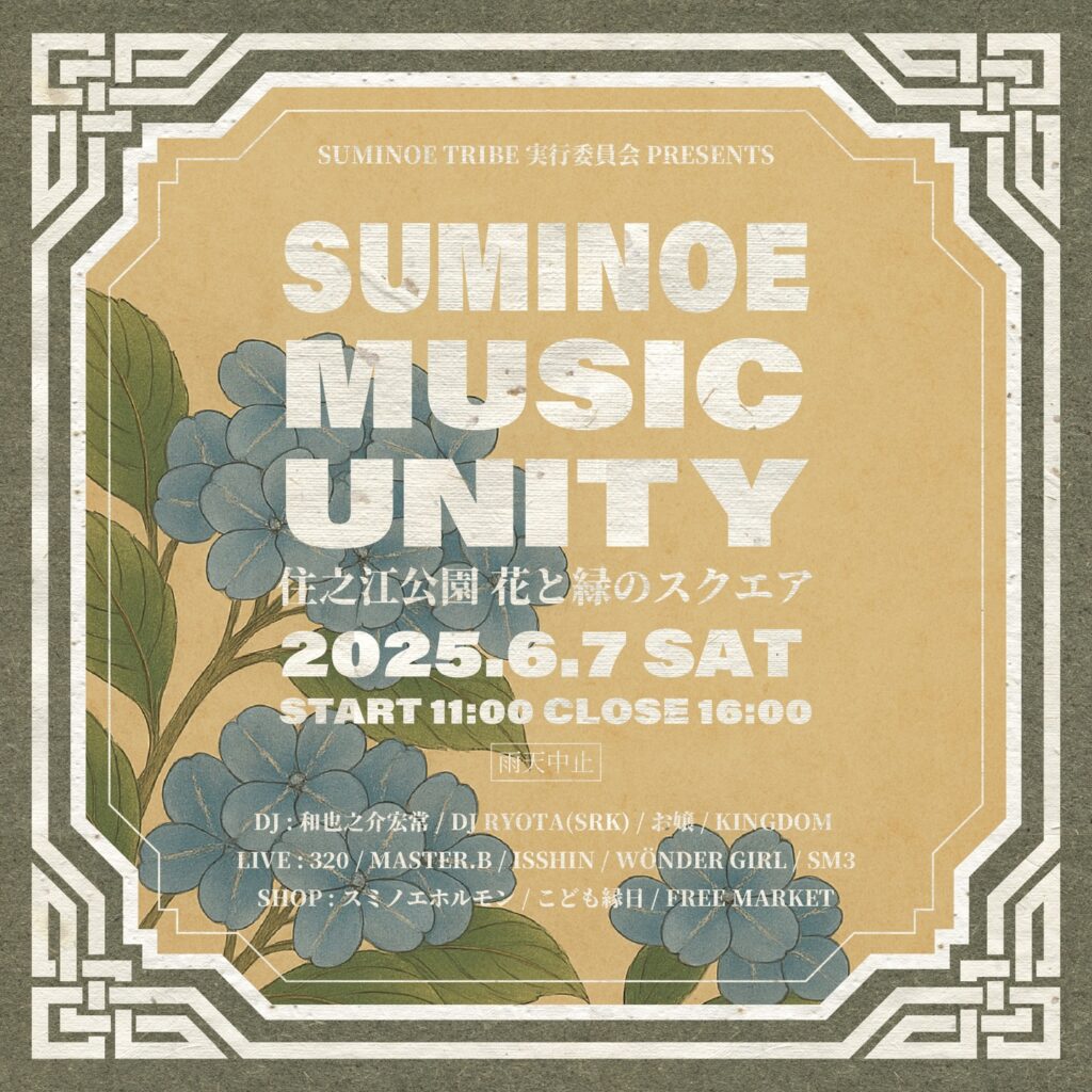 住之江公園の花と緑のスクエアにてDJ&LIVEのイベントを開催します。 入場無料で縁日なども行います! ぜひ遊びにきてください