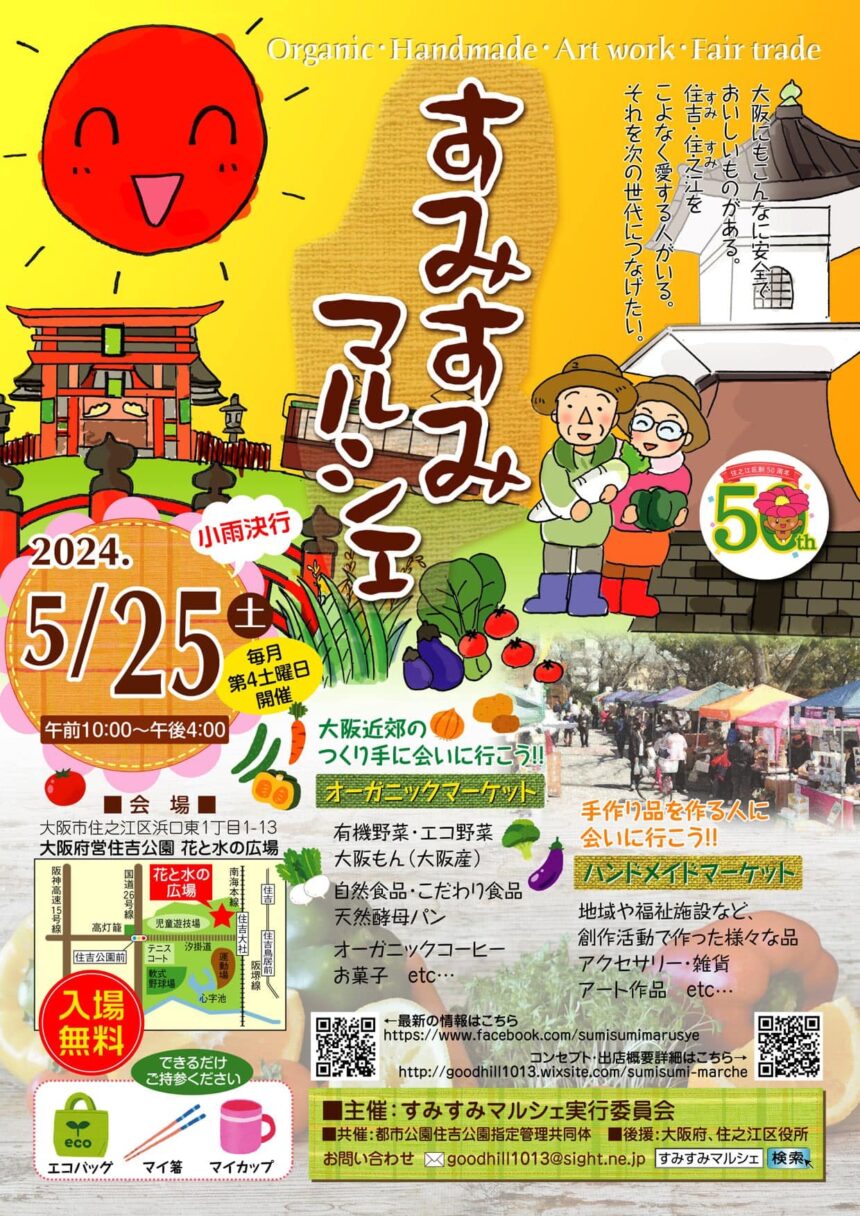 伝統ある住吉大社のおひざ元で毎月第4土曜日に開かれるこだわり食品や有機野菜、手作り品が集まるマルシェです。