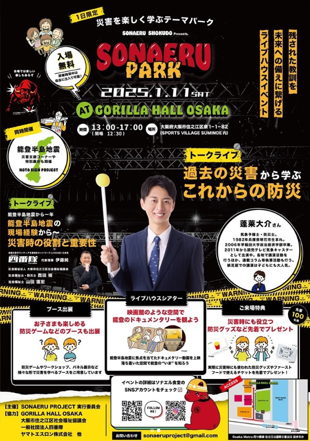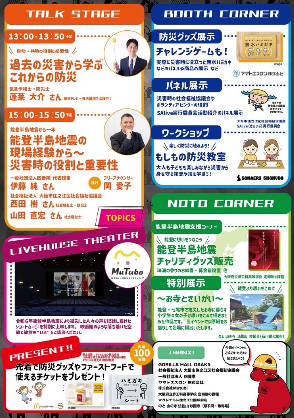 気象予報士の蓬莱大介さんのトークライブや、先着で防災グッズのプレゼントもありますよ☺