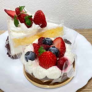 店内のショーケースには、カットケーキやホールケーキがたくさん並んでいます。ろうそくやチョコプレートもあります。