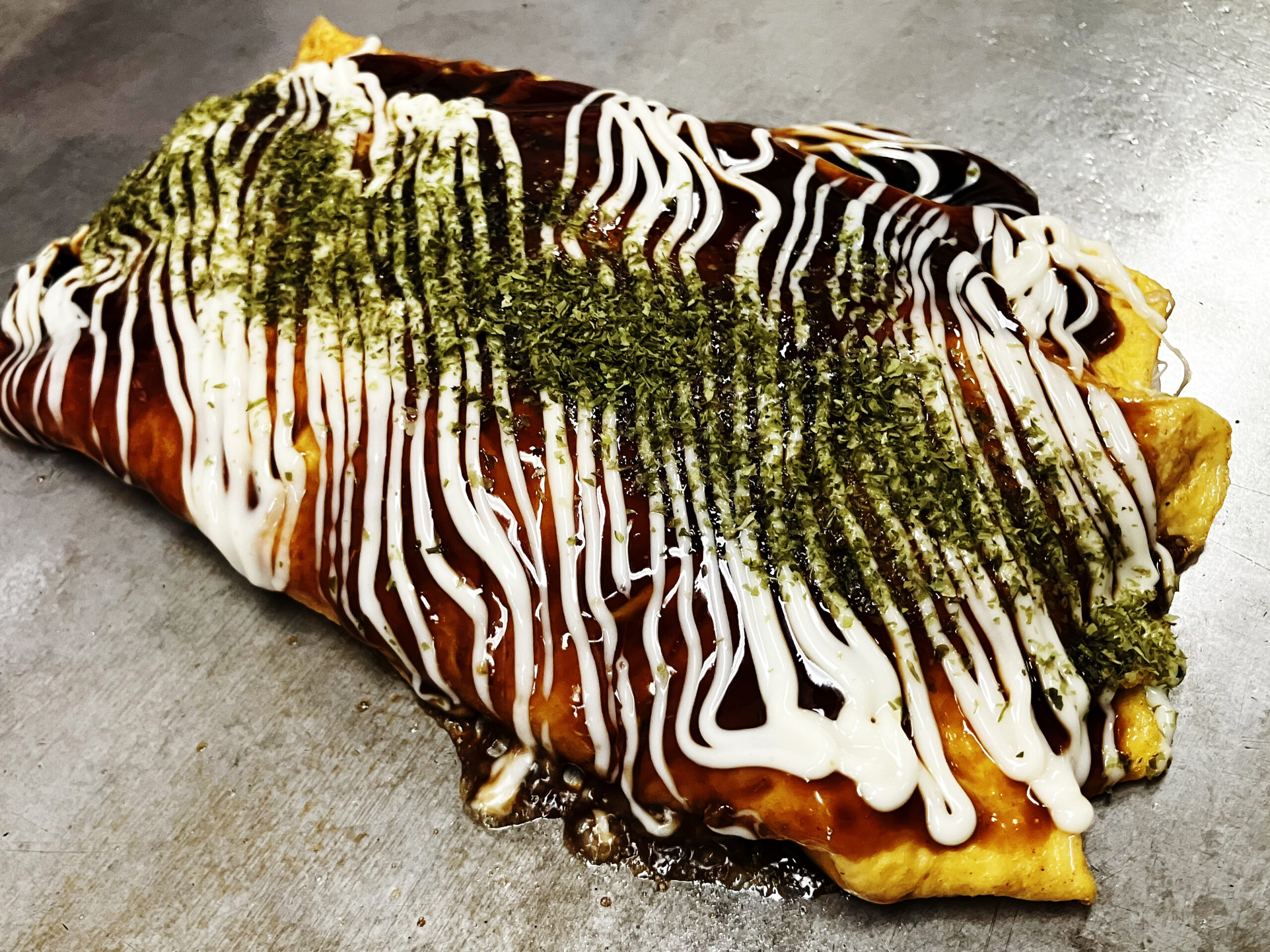 看板メニューのお好み焼きは、外はカリッと中はふんわり。甘みとシャキシャキ感が絶妙です。