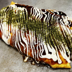 看板メニューのお好み焼きは、外はカリッと中はふんわり。甘みとシャキシャキ感が絶妙です。
