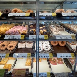 好きなドーナツを自分で選び、トレーに乗せます。定番のドーナツ(ポン・デ・リングやエンゼルフレンチなど)だけでなく、パイ、飲茶、ホットドッグも取り扱っています。