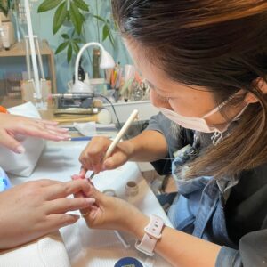 ネイルチップを全て剥がすのではなく、削って、切って、剥がさずに足していく(ベースだけ残していく)爪にやさしい施術方法です。