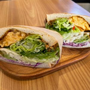 キーマカレーのサンドイッチの中身は、卵、レタス、きゅうり、紫キャベツ、れんこん、キーマカレーが入っていました。れんこんが入っているのが珍しいです。