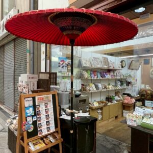 店舗前を通ると、お茶の香ばしい香りが漂い、そそられます。店舗前にある和傘は、風情があり、日本を感じます。