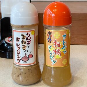 オリジナルのドレッシングがあります。“さわやか柑橘ドレッシング”は、その名の通り、さわやかな柑橘系の風味と味わいで大盛りのキャベツがあっという間になくなります。