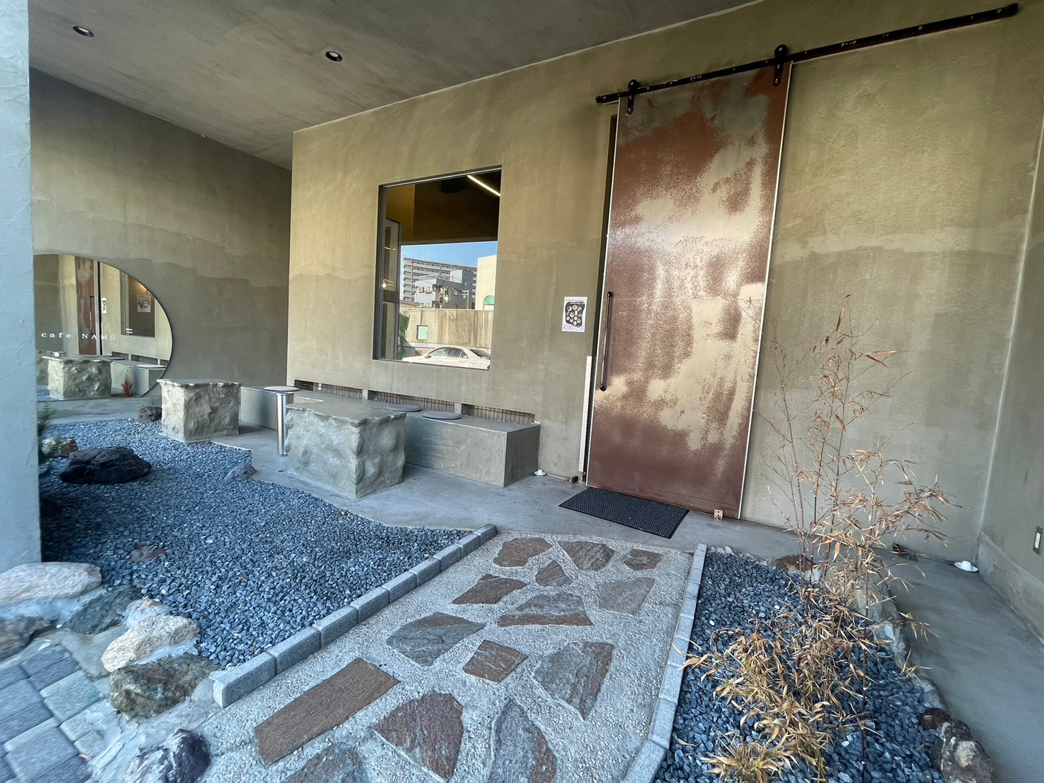 地図で検索すると、北加賀屋駅から歩いて行ける距離だと分かった。 「こんなところにカフェがあったのか?」と思いながら、地図を片手に進んでいく。 路地を曲がったところをのぞいてみると、路地の奥に目当ての店舗の看板があった! 「こんなところに本当にカフェがあった!」と驚いたと同時に、とてもオシャレな店舗だと思った。 重厚感のある、店舗の扉を開けようとすると、勝手に開いた! 自動ドアかと思ったら、他のお客さんが開けただけだったので、友人と顔を見合わせて笑った。 店員さんに尋ねると、この夏でオープンから3年だという。 地元に住んでいても気づかなかったが、初めての方、遠方からの方、常連さんなど、色々な方が訪れるようだ。 店舗に行った時も、学生から大人まで、多くの方が訪れていた。 1人で訪れる方も多くいたので、1人での来店も安心だ。 外観、店内、メニューなど、全てがとてもオシャレで、思わず写真を撮りたくなる空間。 どこで撮っても映えること間違いなし!!
