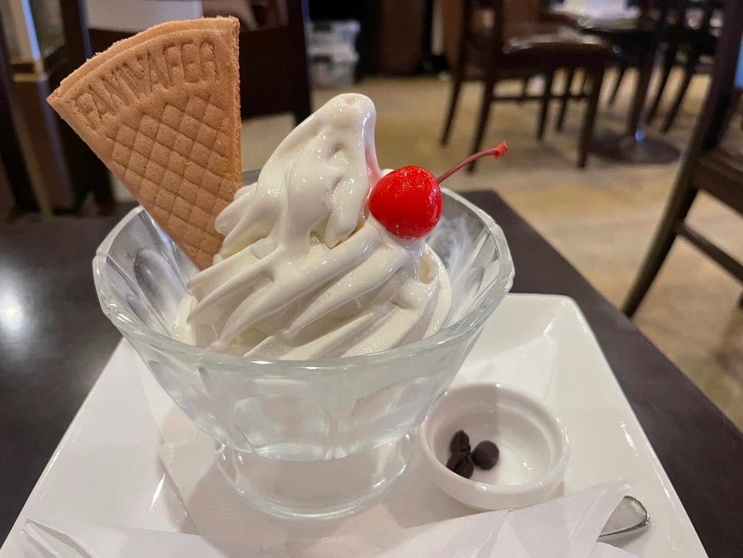 “濃厚ミルクソフトクリーム”を注文すると、一緒に珈琲豆が提供される。なんと、アイスクリームと一緒にそのまま珈琲豆を食べるらしい。