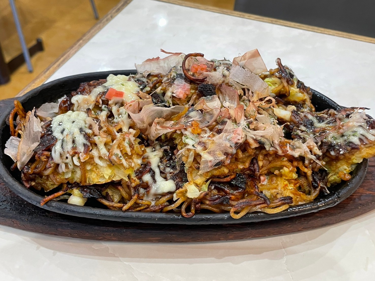 味希のメニューは全て手作りだ。手際よく材料を切り、あっという間に2品が完成していく。“お好み焼き屋さん”ならではの鉄板の上で作られていくお好み焼きは、見た目に風情があり、食欲をそそる。